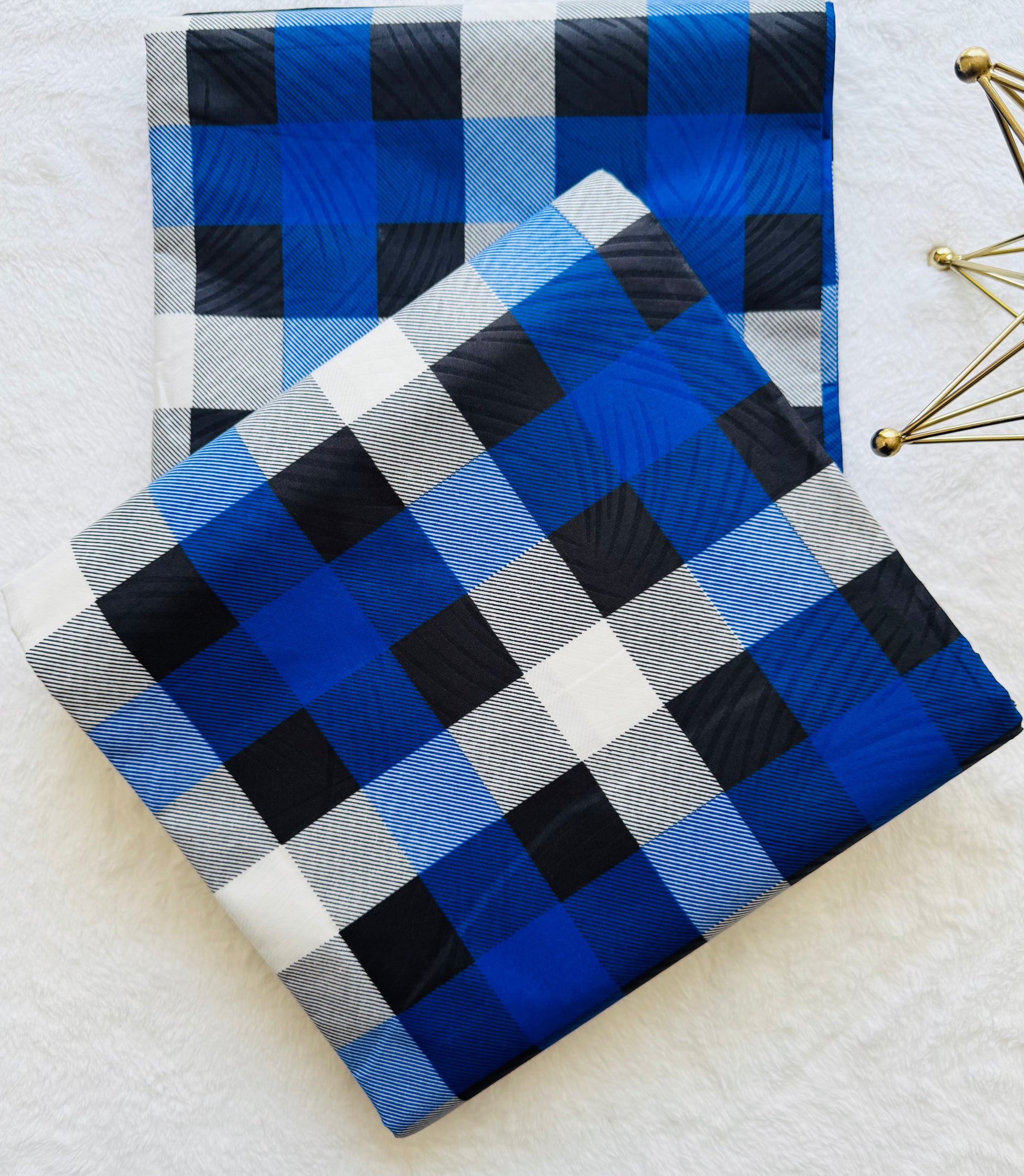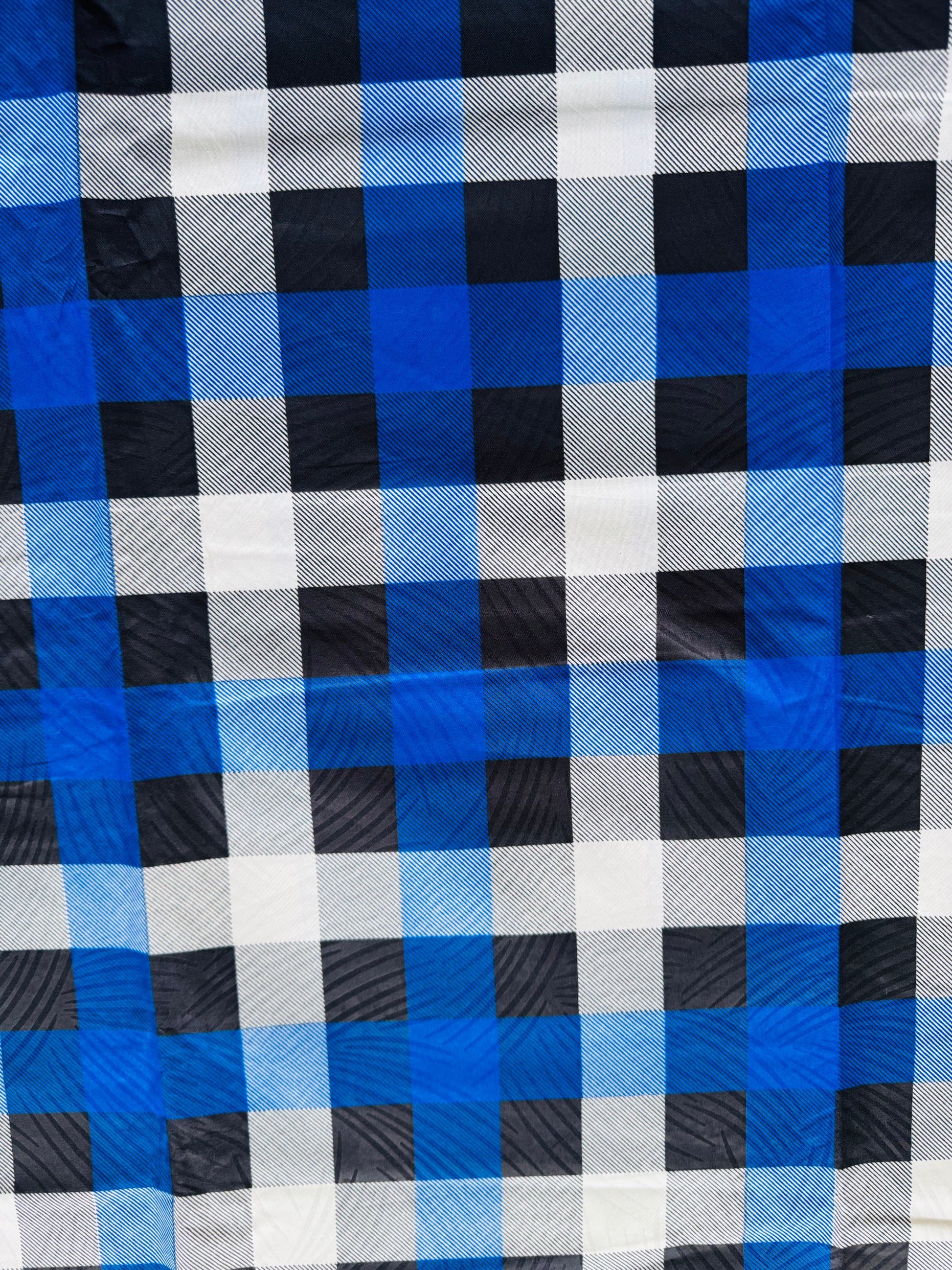 Close-up of a blue, black, and white checkered fabric pattern.75% Polyester (Small Grade Ankara)